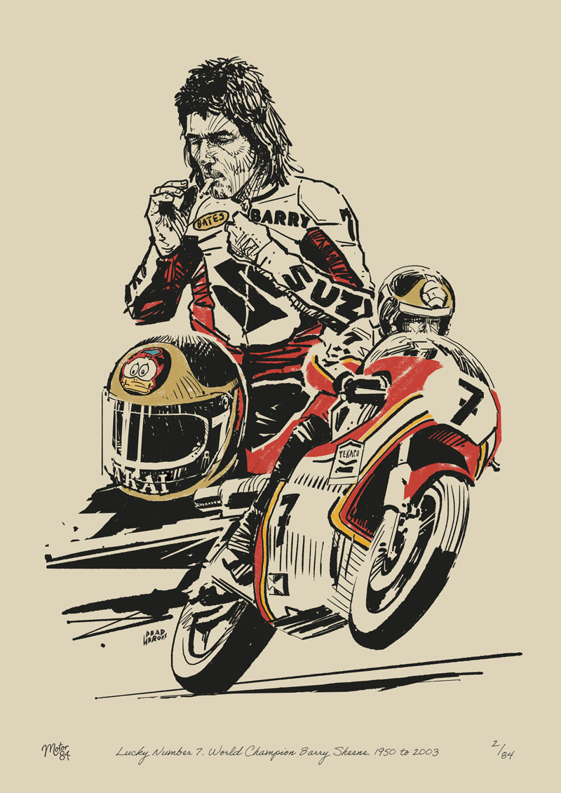 Showing Sheene caning his 1976 Suzuki XR14 RG500 to victory. The coolest rider on the grid, Sheene liked the high life and lived it to the full. Known for his trade mark 'Donald Duck' graphic on his helmet, he drilled a hole in the chin piece of his crash helmet so he could smoke a cigarette while waiting on the starting grid.